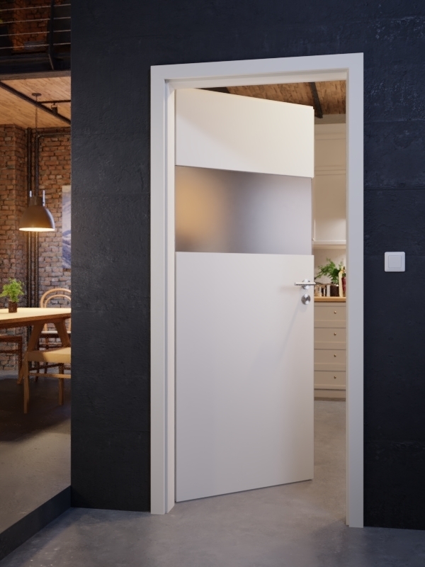 W górnej części drzwi znajduje się szeroki, poprzeczny pas świetlny. W ten sposób pomieszczenie będzie jasne, a stojąc tuż przed drzwiami, będzie można dyskretnie zajrzeć do środka.