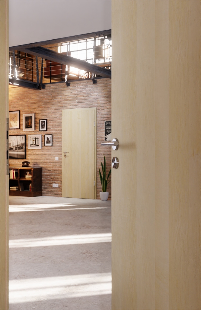 Naturalna obróbka drewna: Drzwi wewnętrzne Optima firmy Jeld-Wen, fornirowane drewnem naturalnym w kolorze klonu kanadyjskiego Living, łączą w sobie doskonałą jakość wykonania z elegancką powierzchnią drewnianą.