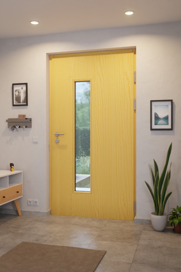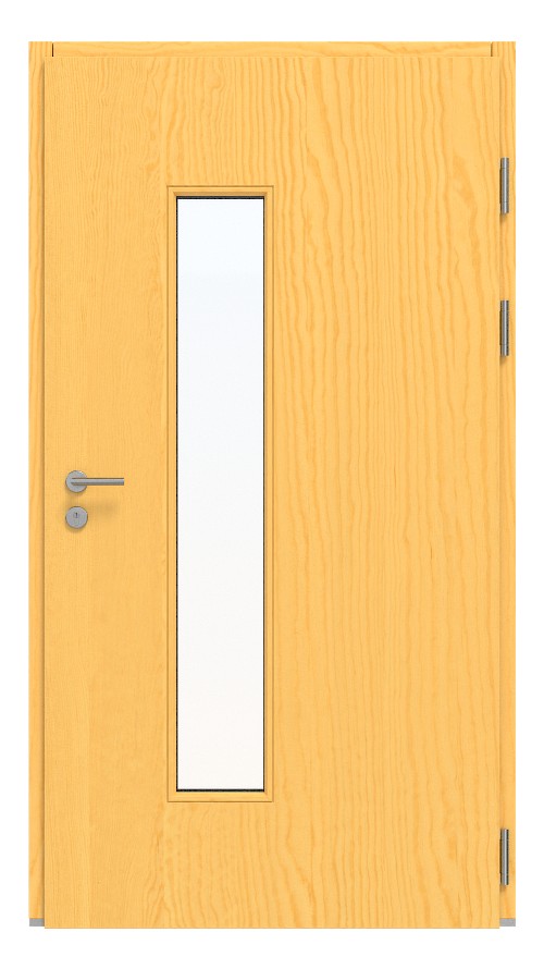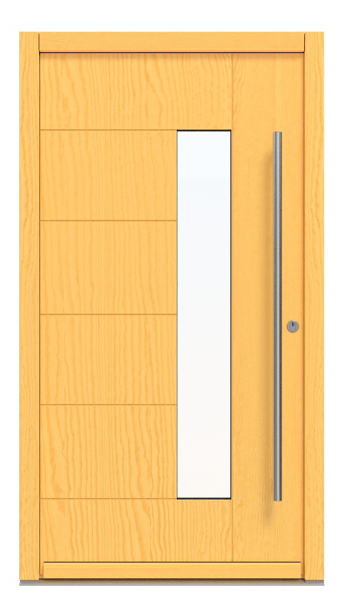 Wąskie, przesunięte w stronę zamka przeszklenie zapewnia przyjemny dopływ światła do pomieszczenia. Pionowe i poziome rowki uzupełniają wygląd skrzydła drzwiowego i nadają mu linearną strukturę.