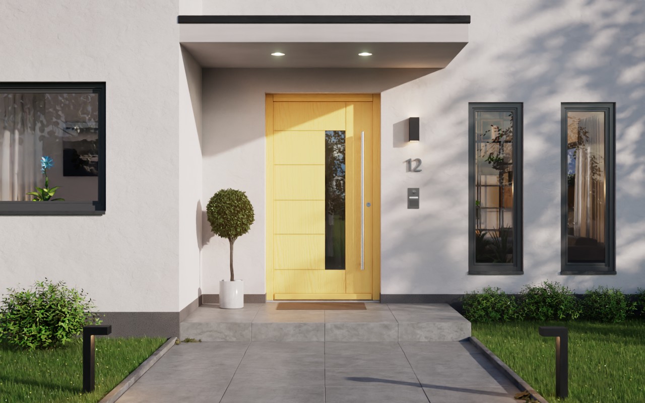 Drzwi zewnętrzne o solidnej konstrukcji pełnego skrzydła zapewniają dobrą izolację akustyczną. Ich bardzo dobra izolacja cieplna jest wspierana przez potrójne szklenie izolacyjne i termicznie przerywany próg podłogowy. Dodatkową stabilność i idealne dopasowanie drzwi zapewniają trzy asymetrycznie rozmieszczone, regulowane w trzech wymiarach zawiasy. Ukryta, ciągła listwa zamykająca, automatyczny zamek z wielopunktowym zamknięciem oraz wkładka profilowa z zabezpieczeniem przed wierceniem stanowią niezawodną podstawę bezpieczeństwa.