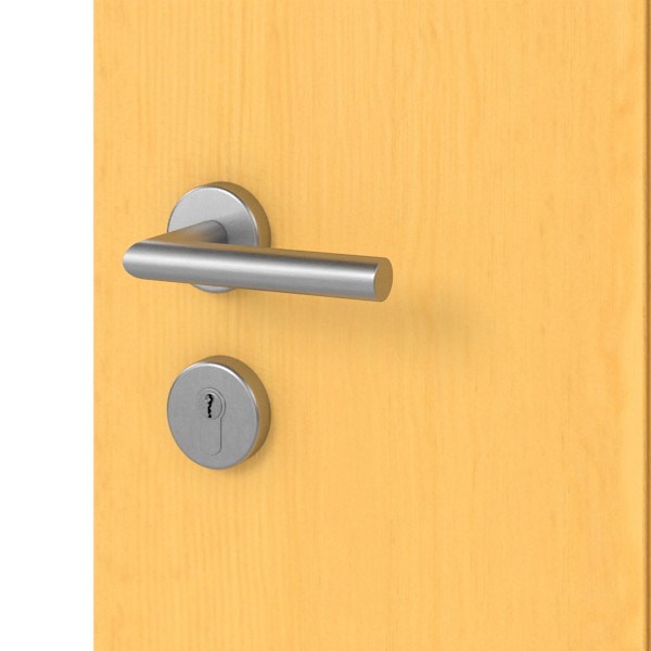 Eleganckie okucia ze stali szlachetnej zaokrąglone dopełniają podstawowe wyposażenie drzwi wejściowych do domu. Zewnętrzna rozeta jest wyposażona w dodatkową osłonę cylindryczną , która służy jako zabezpieczenie przed wyrwaniem.