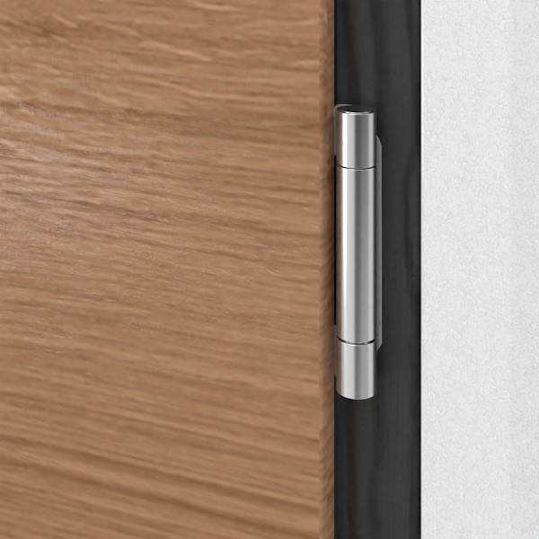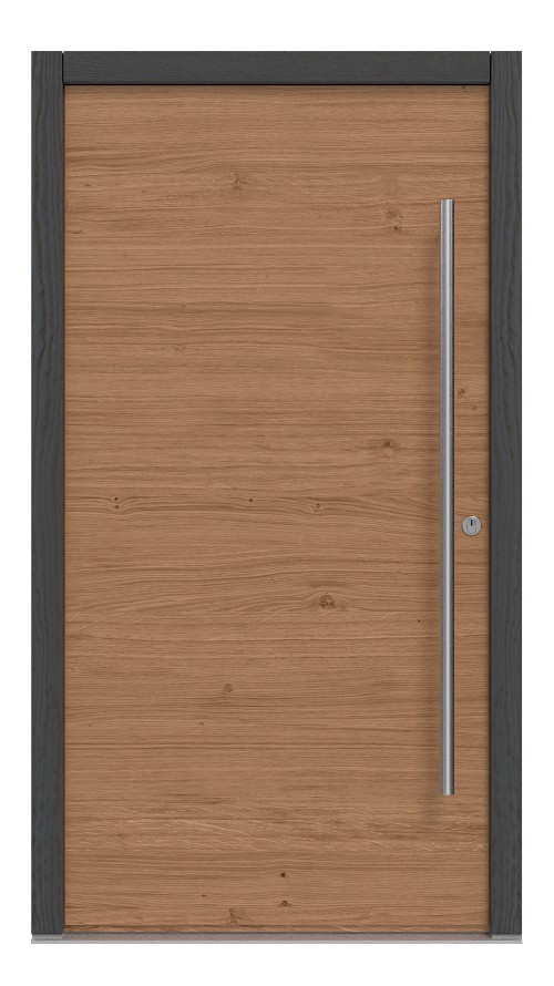 Skrzydło drzwiowe ze szczotkowanym fornirem poprzecznym zachwyca naturalną powierzchnią i przyciąga wzrok. W połączeniu z ramą w kolorze RAL 7016 i eleganckimi okuciami ze stali szlachetnej tworzy gustowną całość.