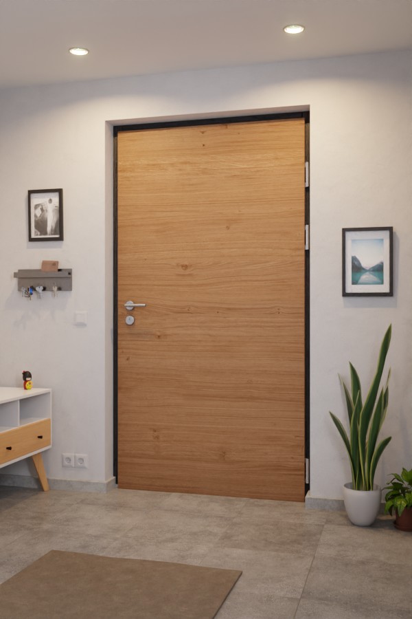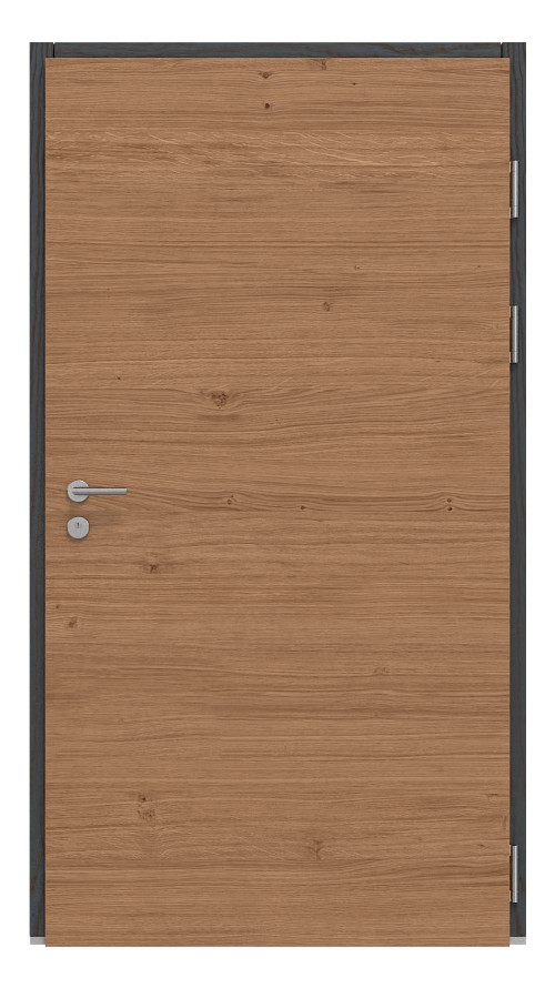• Cechy szczególne: Skrzydło drzwiowe jest wykonane na zewnątrz i wewnątrz ze szczotkowanego forniru poprzecznego (modrzew lub dąb), rama maskująca w kryjącym odcieniu RAL 7016