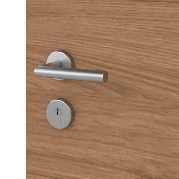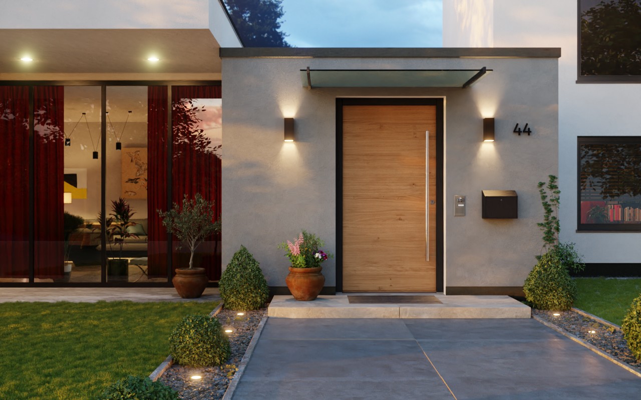 • Zakres dostawy: Drzwi wejściowe z ramą, progiem, zawiasami, zamkiem, cylindrem profilowym z 5 kluczami oraz okuciem ze stalowym uchwytem (1500 mm, okrągłym, zamontowanym na prostokątnej konsoli uchwytu), wewnętrznym przyciskiem i okrągłymi rozetkami, dodatkowe elementy do skonfigurowania.