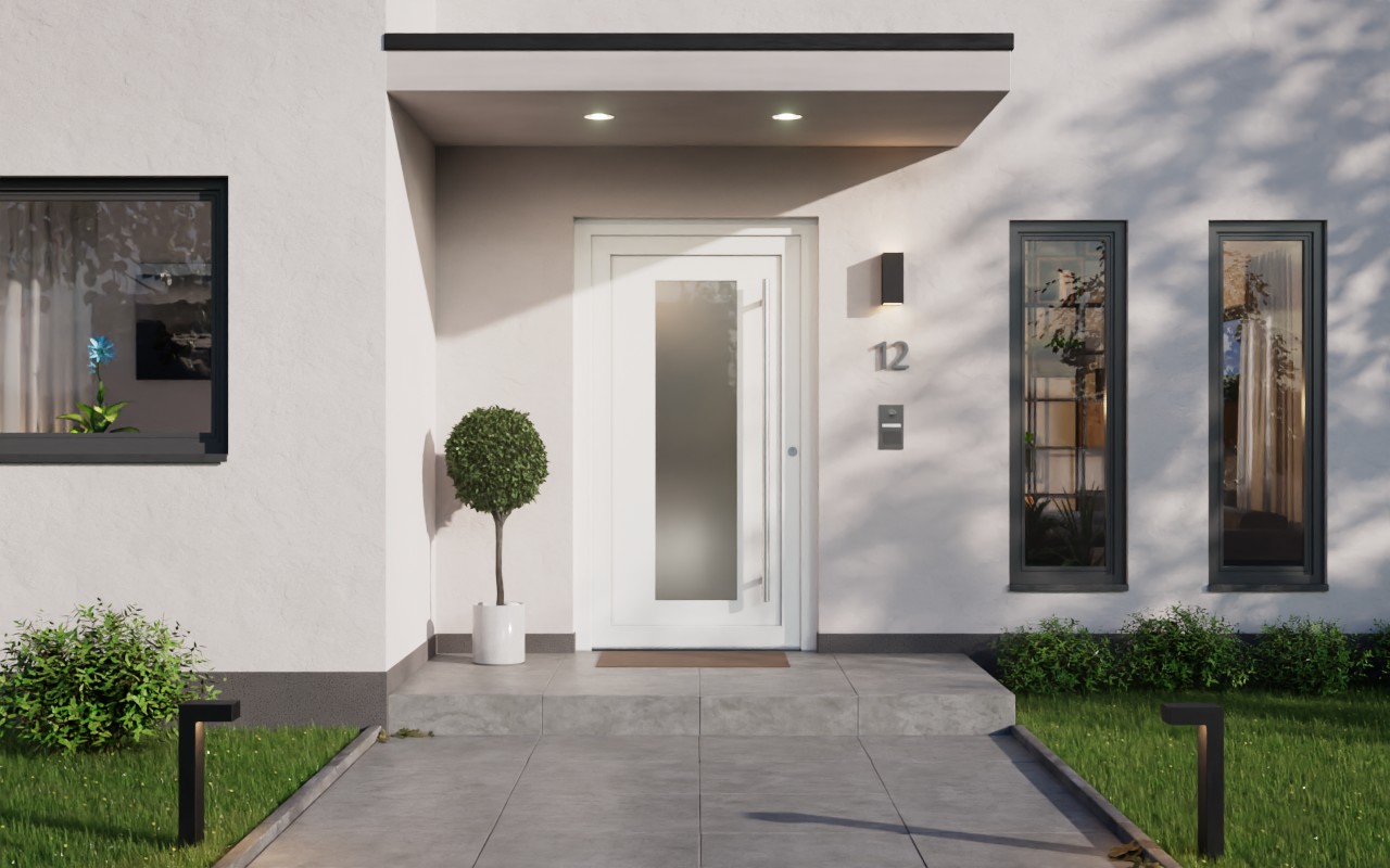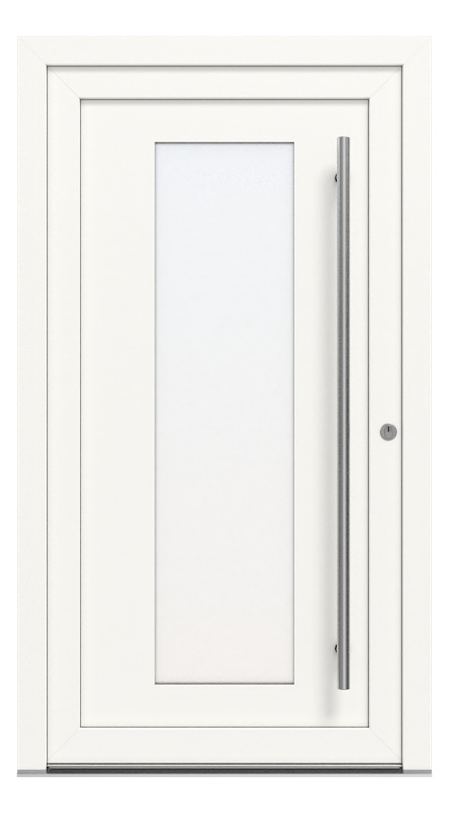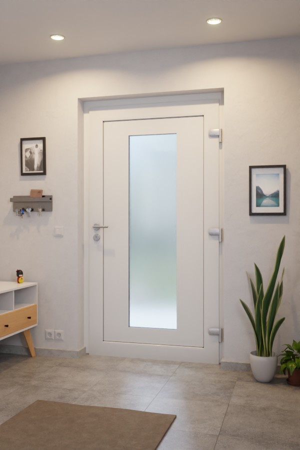 Duże przeszklenie drzwi wejściowych do domu nadaje przedpokojowi jasny i otwarty charakter. Szkło satynowe chroni jednocześnie przed niepożądanym wglądem. Ponadto modny design rezygnuje z dodatkowych elementów dekoracyjnych, dzięki czemu idealnie komponuje się z indywidualnym stylem wnętrza.