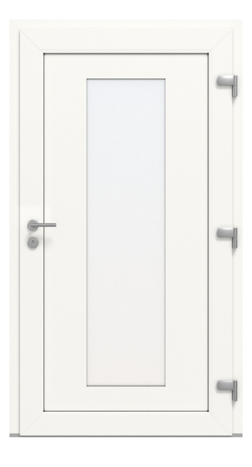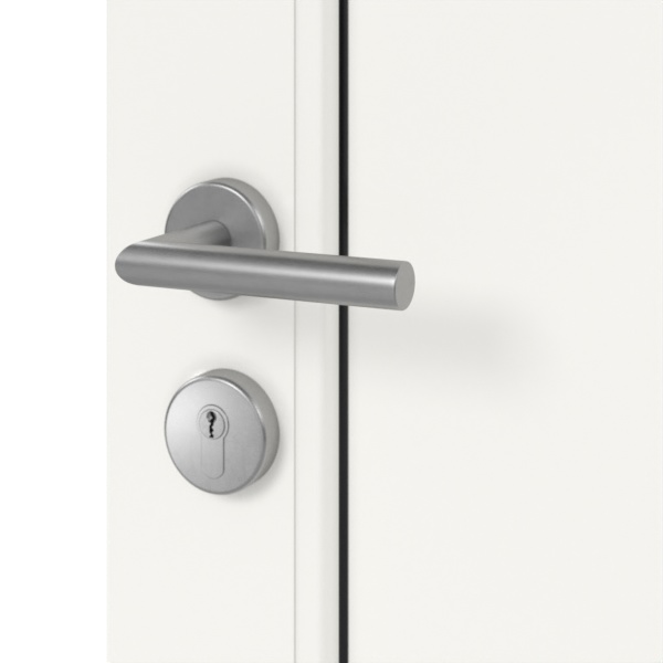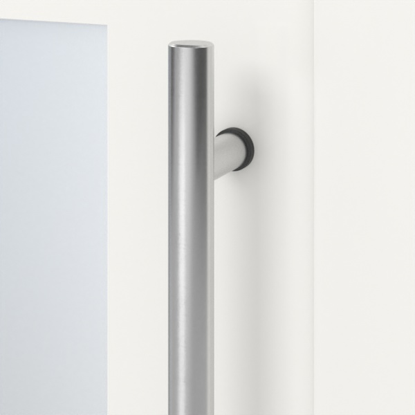 Nowoczesne drzwi zewnętrzne wyposażone są w wielopunktowe zamknięcie, progi aluminiowe termicznie przerywane oraz solidne , dwuczęściowe zawiasy. Elegancki zestaw okuć ze stali szlachetnej z prostym uchwytem drążkowym i rozetą zakrywającą cylinder stanowi ostatni szlif tego przejrzystego designu. Widok drzwi od wewnątrz jest również dopełniony zestawem klamek ze stali szlachetnej .