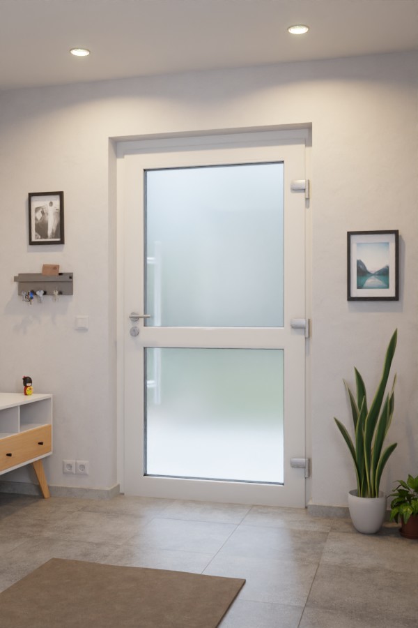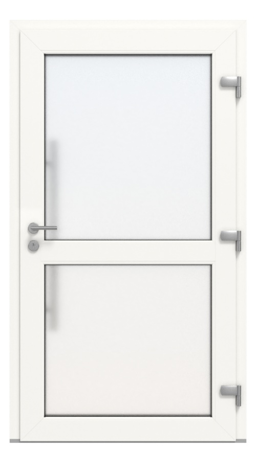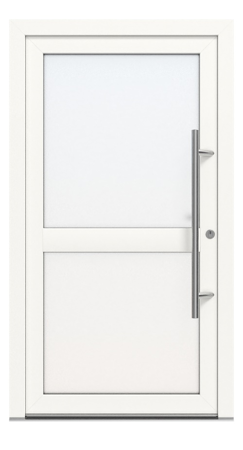 Pod względem wizualnym drzwi te charakteryzują się przesuniętym profilem skrzydła. Centralnym elementem designu tych drzwi z tworzywa sztucznego są dwa satynowane wycięcie na szybę, które przyciągają uwagę swoimi dużymi rozmiarami.