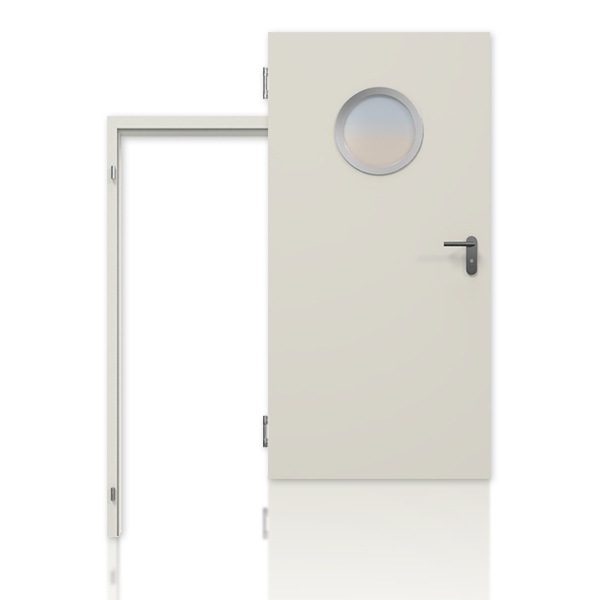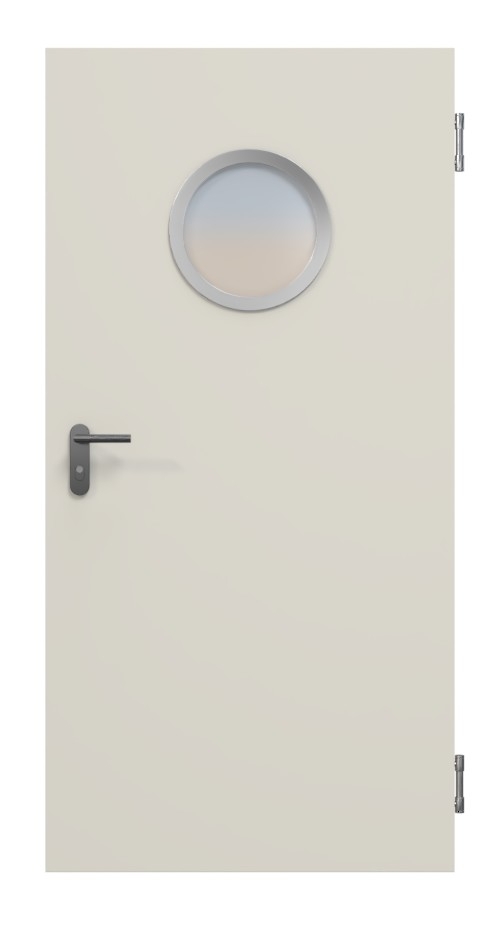 Wąskie, okrągłe przeszklenie zapewnia dopływ światła dziennego do wnętrza. W standardzie znajduje się rama szklana z naturalnego aluminium z listwami mocującymi szkło, zamontowana po stronie przeciwległej do zawiasów.