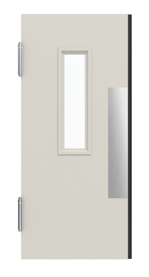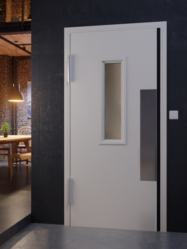 Specjalne zawiasy do drzwi wahadłowych zapewniają, że drzwi automatycznie powracają do pozycji wyjściowej. Skrzydło drzwiowe o grubości 62 mm składa się z konstrukcji warstwowej klejonej na całej powierzchni i jest standardowo pokryte podkładem w kolorze szaro-białym (podobnym do RAL 9002). W zestawie znajduje się przeszklenie wraz z niezbędnym szkleniem oraz obustronny płaski uchwyt ze stali szlachetnej.