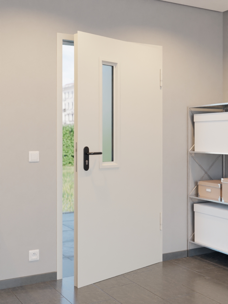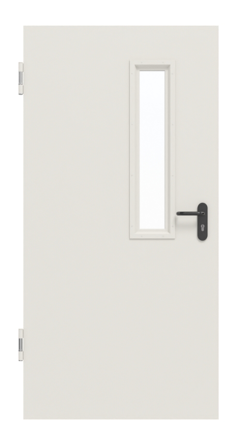 Drzwi stalowe mają grubość 65 mm i składają się z podwójnej, w pełni klejonej konstrukcji kompozytowej. Powłoka jest w kolorze zbliżonym do szaro-białego RAL 9002. Dodatkowo drzwi wyposażone są w zawiasy konstrukcyjne z łożyskami kulkowymi.