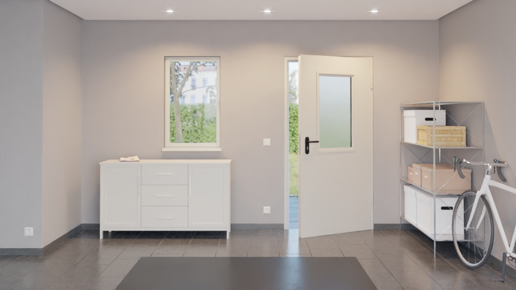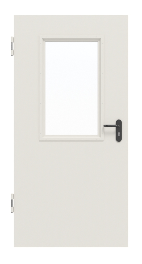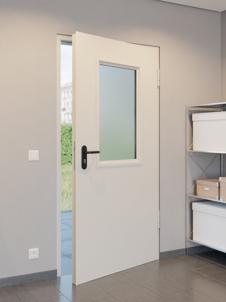 Drzwi stalowe składają się z podwójnej, w pełni klejonej konstrukcji kompozytowej i mają grubość 65 mm. Powłoka w kolorze szaro-białym RAL 9002 jest zagruntowana. Dodatkowo zawiasy konstrukcyjne z łożyskami kulkowymi skutecznie łączą drzwi z ościeżnicą.