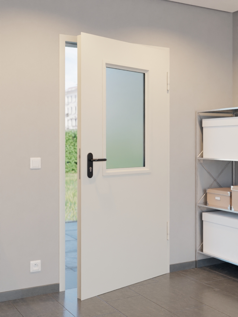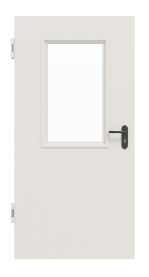 Wewnątrz znajduje się podwójna, w pełni klejona konstrukcja kompozytowa. Drzwi mają grubość 65 mm i powierzchnię podkładową w odcieniu szaro-białym RAL 9002. Aby zapewnić połączenie z ościeżnicą, zastosowano zawiasy konstrukcyjne z łożyskami kulkowymi.