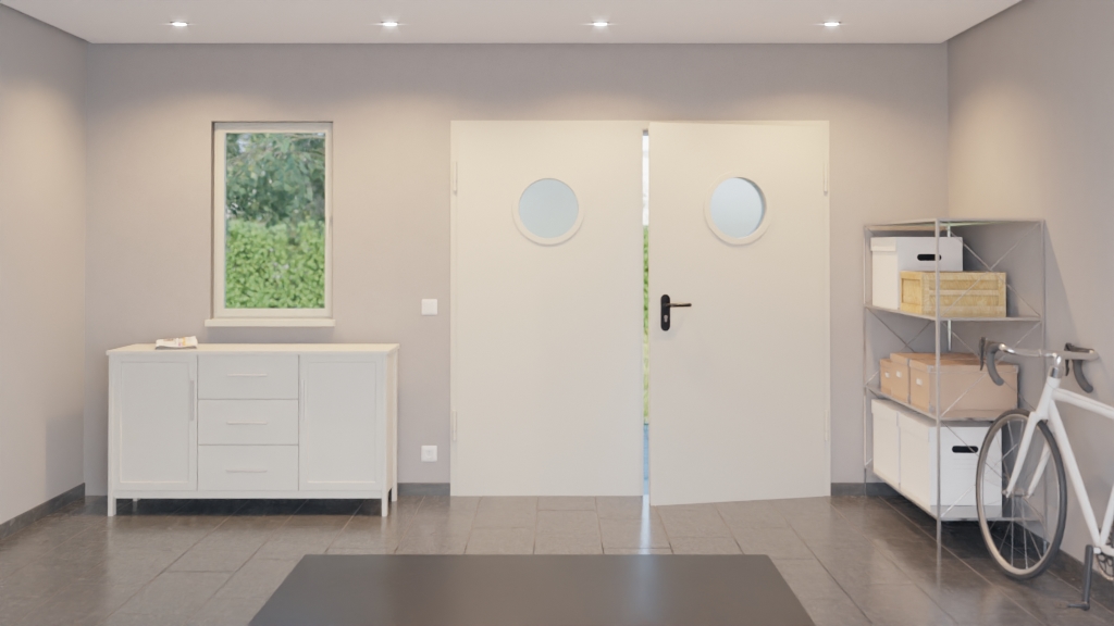 Kompletny zestaw drzwi wewnętrznych od Hörmann, w tym stalowe drzwi wielofunkcyjne, ościeżnica i klamka: