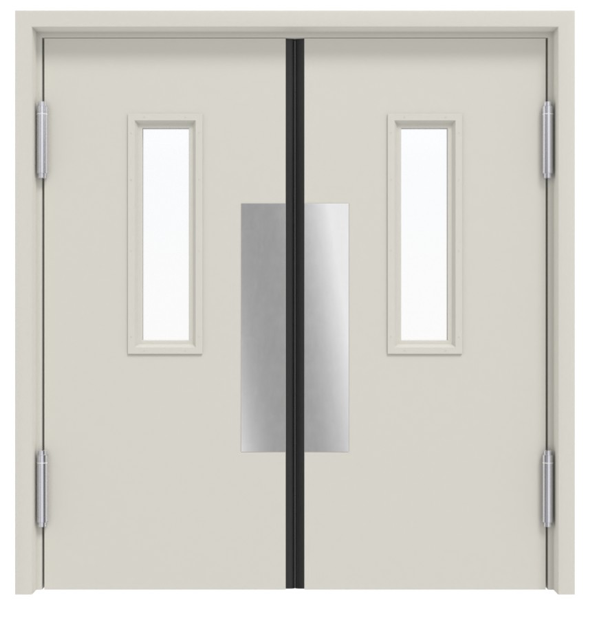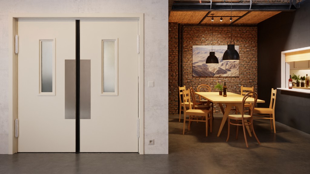 Automatyczne cofanie się obu skrzydeł drzwiowych zapewniają specjalne zawiasy drzwi wahadłowych. Mają grubość 62 mm i składają się z konstrukcji warstwowej klejonej na całej powierzchni. Zarówno ościeżnica, jak i drzwi wahadłowe dwuskrzydłowe mają standardowo powierzchnię zagruntowaną w kolorze szaro-białym (podobnym do RAL 9002). Za dodatkową opłatą istnieje wybór innych opcji kolorystycznych. Ponadto w zestawie znajdują się szklenia niezbędne do wykonania przeszkleń oraz dwustronne płaskie uchwyty ze stali nierdzewnej.