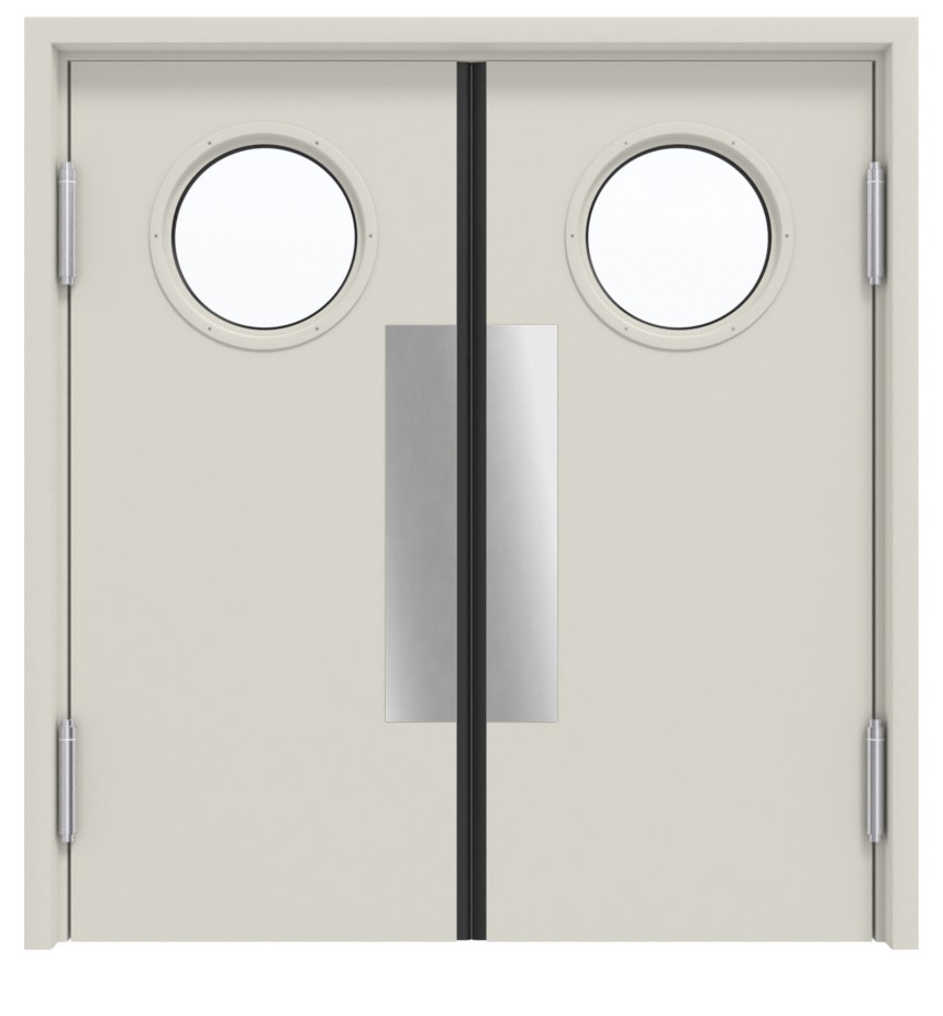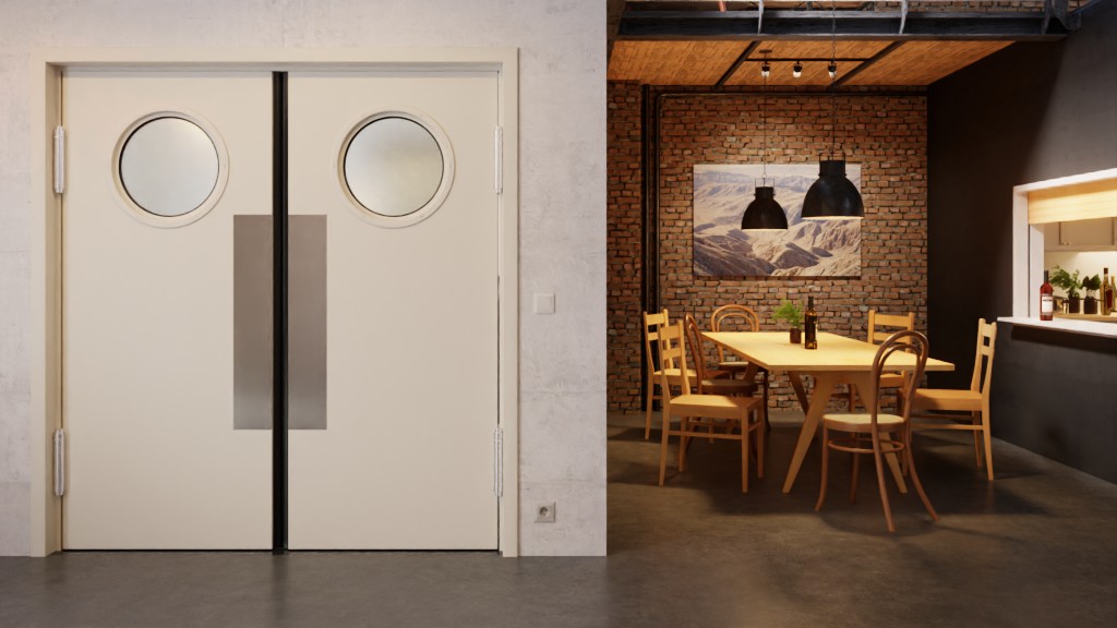 Specjalne zawiasy drzwi wahadłowych umożliwiają wahadłowe otwieranie obu skrzydeł drzwiowych. Mają grubość 62 mm i składają się z konstrukcji warstwowej klejonej na całej powierzchni oraz zagruntowanej warstwy wierzchniej w kolorze szaro-białym (podobnym do RAL 9002). Inne wersje kolorystyczne są dostępne za dodatkową opłatą. W zakres dostawy wchodzą również szyby niezbędne do wykonania przeszklenia oraz obustronne płaskie uchwyty ze stali szlachetnej.