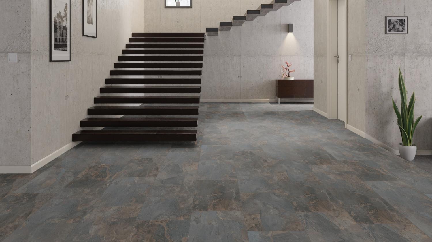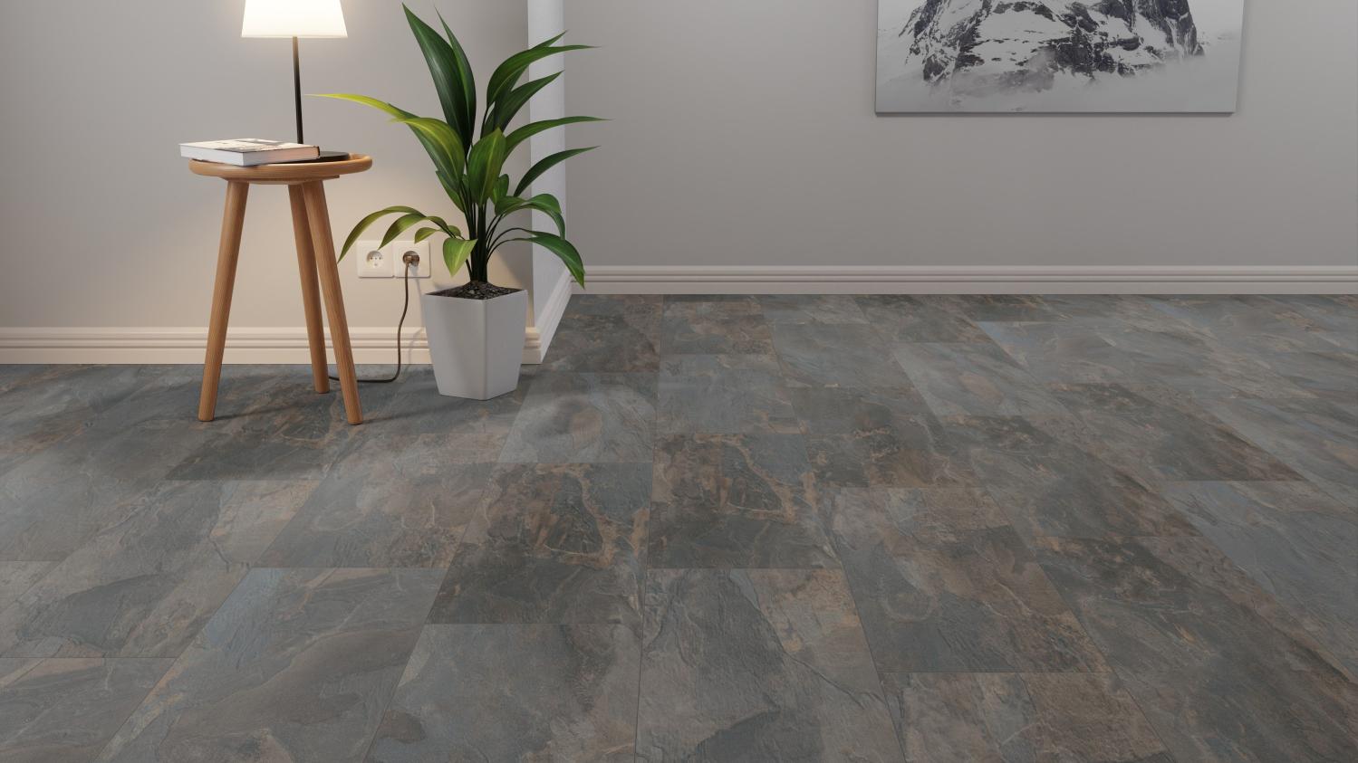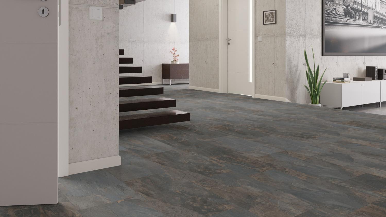 Podłoga laminowana na klik w nowoczesnym wzorze łupka z łączeniem w kształcie litery V na całym obwodzie.