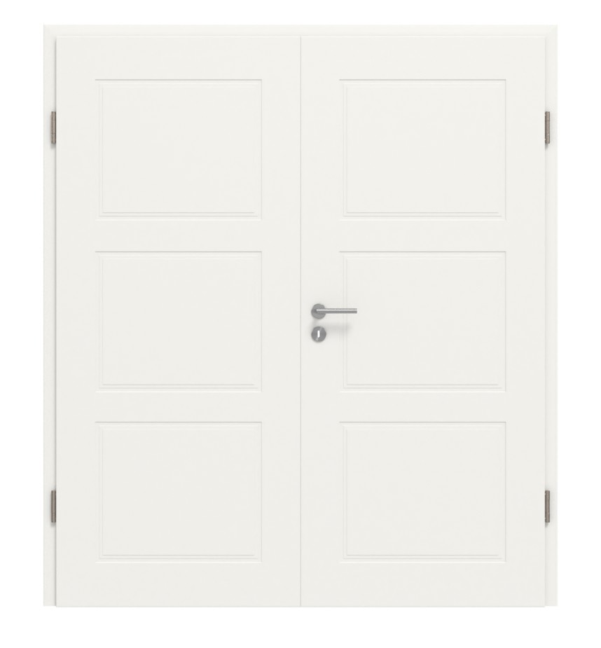 Rdzeń obu skrzydeł drzwiowych jest wyposażony w płytę wiórowo-otworową. Niezawodne zamocowanie w ramie zapewniają 3-częściowe zawiasy, w które wyposażone są oba skrzydła drzwiowe. Niezawodną izolację akustyczną podczas zamykania drzwi zapewnia zamek z kluczem płaskim Whisper Comfort.