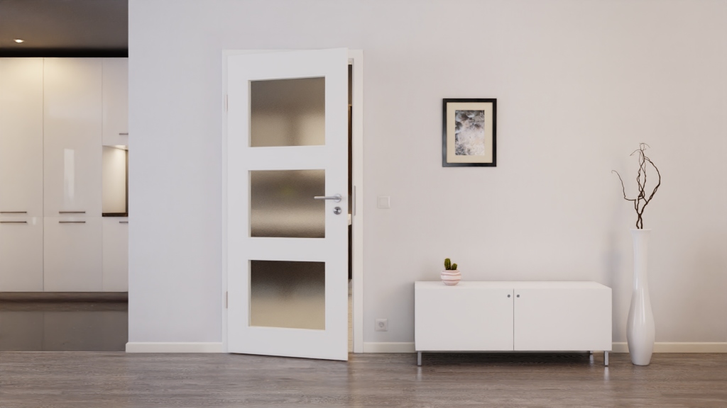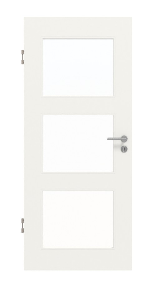 Biała powłoka lakiernicza jest bardzo trwała, ponieważ nakładana jest na skrzydło drzwiowe w kilku warstwach. Światło wpada do pomieszczeń przez trzy kwadratowe wycięcia na szybę, które są osadzone w listwach mocujących szklane panele.
