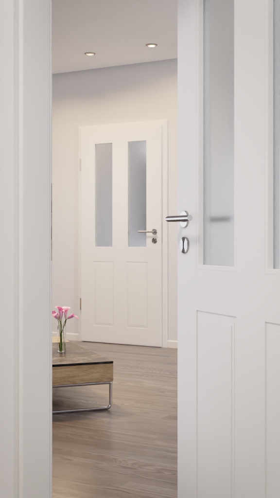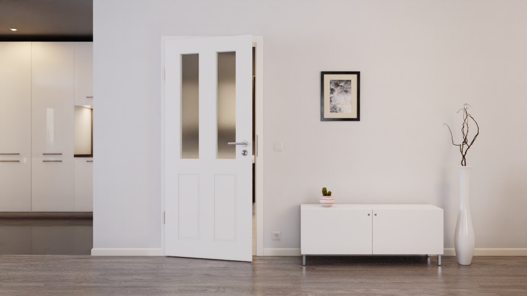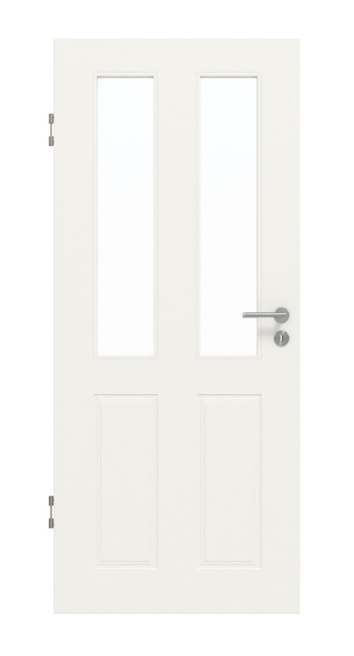Cztery prostokąty wyróżniają się dzięki wyfrezowanym otworom na skrzydle drzwiowym. W dwóch górnych znajdują się dwa przeszklenia, które są umieszczone w równych z powierzchnią listwach mocujących szkło.