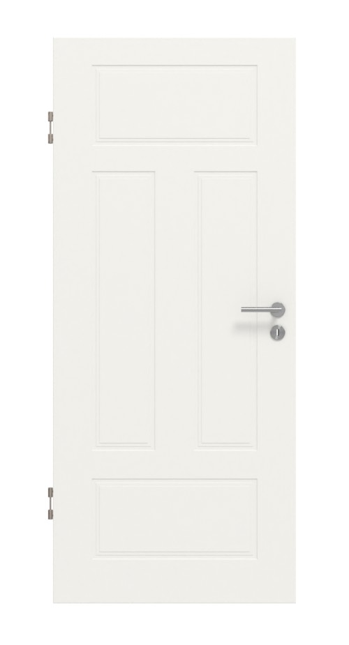 Stylowe frezowania tworzą cztery wąskie prostokąty, tworząc geometryczny wzór na skrzydle drzwiowym. Wielowarstwowa biała powłoka lakiernicza charakteryzuje się wyjątkową trwałością.