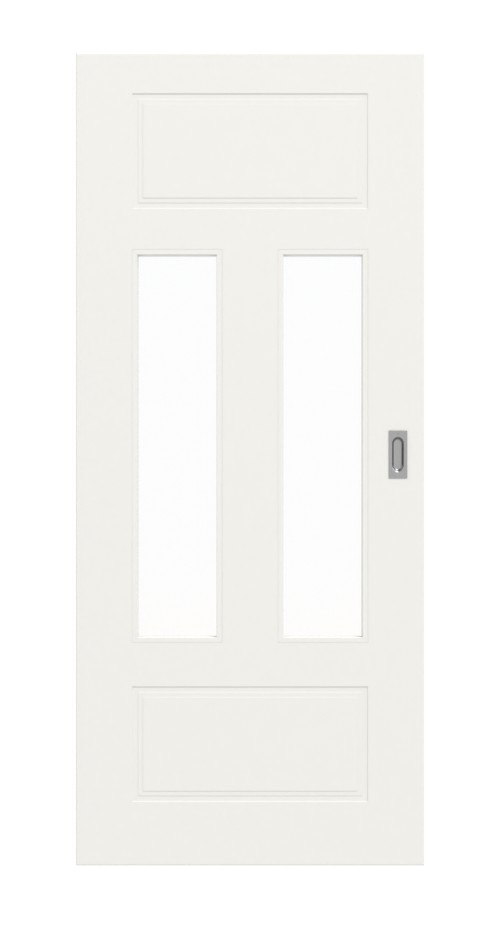 Na skrzydło drzwiowe nałożono białą warstwę lakieru w procesiewielowarstwowym. Dzięki dwóm wąskim wycięciom na szybę w środkowej części światło wpada do pomieszczeń.