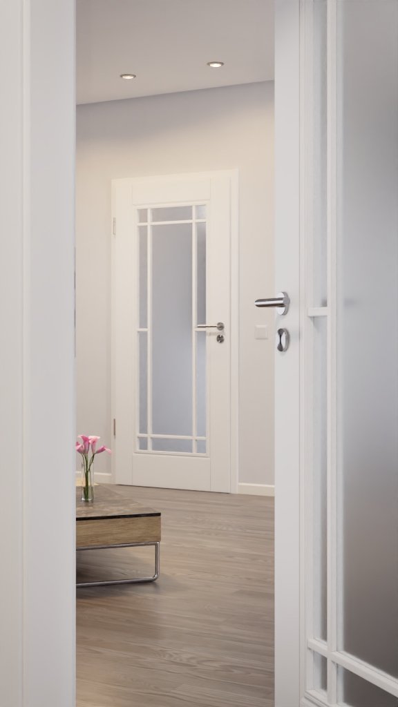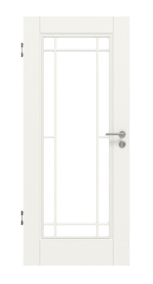 Dzięki dużemu przeszkleniu w centrum skrzydła drzwi, model ten wprowadza przezroczysty design wnętrza. Otaczają go profil frezowany konturowo z zarysowaną V-fugą. Wysokiej jakości lakier w kolorze RAL 9010 lub RAL 9016 nadaje powierzchni olśniewający blask.