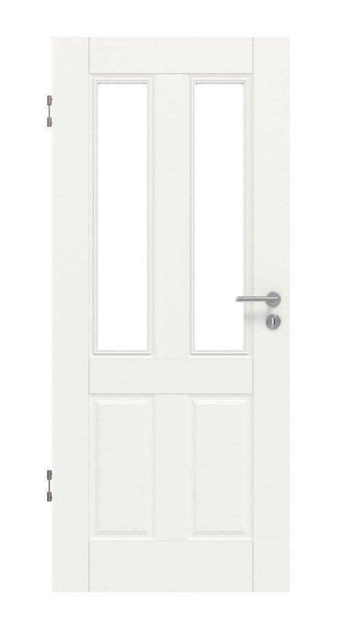 Profilowanie frezowane w konturze tworzy geometryczny wzór na powierzchni. Dzięki wysokiej jakości białemu lakierowi w opcjonalnych kolorach RAL 9010 lub RAL 9016 uzyskuje się olśniewający blask na skrzydle drzwi. Dzięki przeszkleniom do wnętrza wpada światło, co wprowadza przyjazną atmosferę do Twoich pomieszczeń.