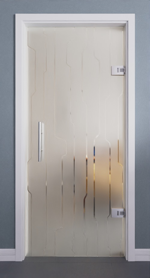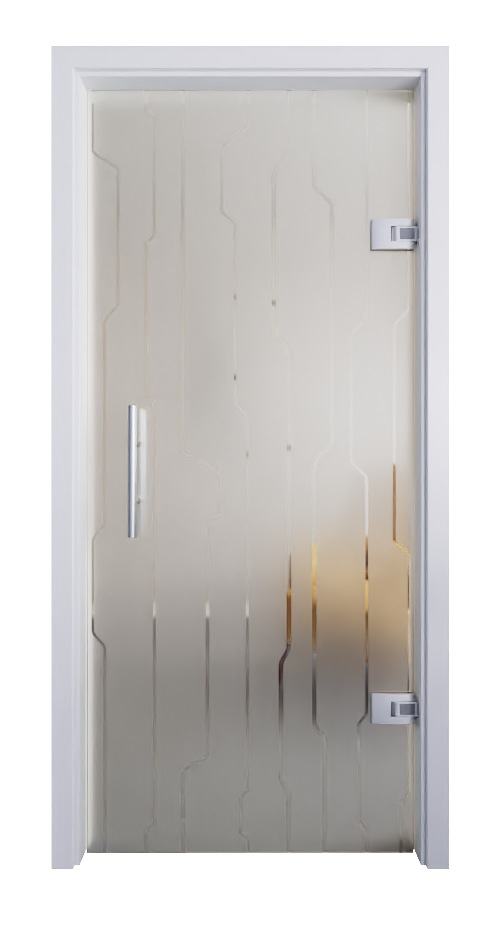 Drobne linie przebiegają dynamicznie przez matowe skrzydło drzwiowe ze szkła. Linie przypominają plan trasy i nadają pomieszczeniom miejski charakter. Szkło przezroczyste tworzy niezwykłe efekty świetlne.