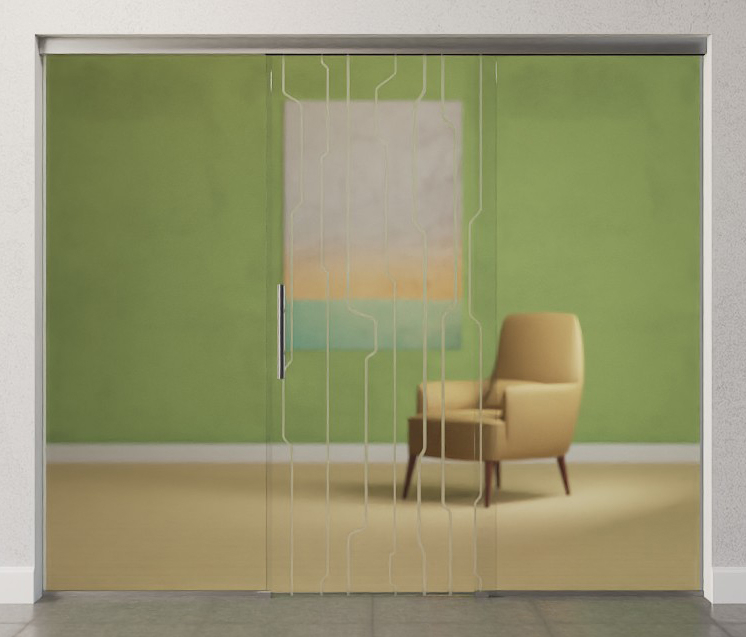 Całkowita szerokość szklanej konstrukcji jest równomiernie rozłożona na skrzydło drzwiowe i elementy boczne, dzięki czemu powstaje symetryczne wykończenie wizualne.
