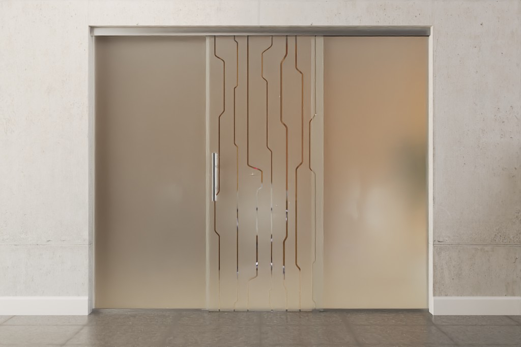 Całkowita szerokość szklanej konstrukcji jest równomiernie rozłożona na skrzydło drzwiowe i elementy boczne, dzięki czemu powstaje symetryczne wykończenie wizualne.