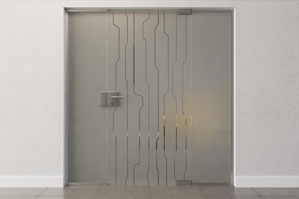Ponadczasowe drzwi szklane z dwoma bocznymi panelami z wytrzymałego szkła hartowanego z specjalną powłoką: