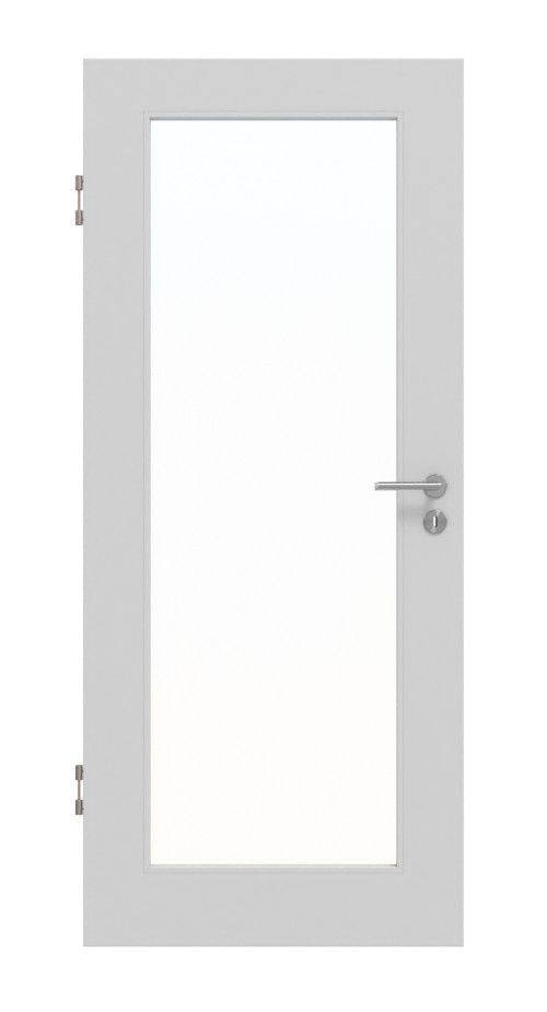 Nowoczesny wygląd zapewnia połączenie jednostopniowych frezowań i szarej warstwy lakieru. W środkowej części skrzydła drzwiowego znajduje się duże przeszklenie między listwami przytrzymującymi szkło, które są zlicowane z powierzchnią.