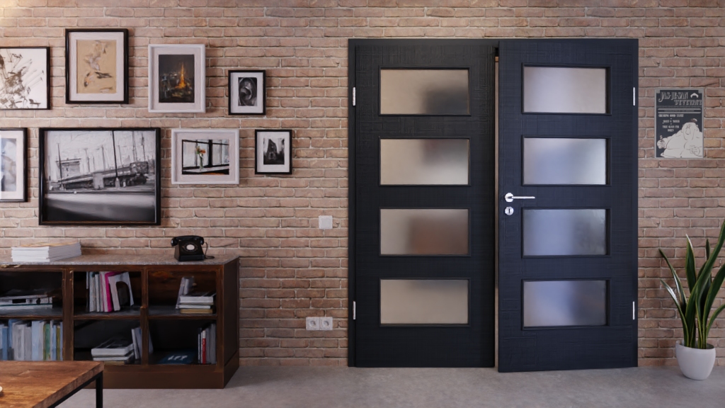 Model drzwi podwójnych z przeszkleniem i dekoracją odporną na UV: