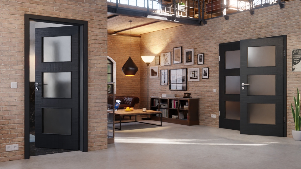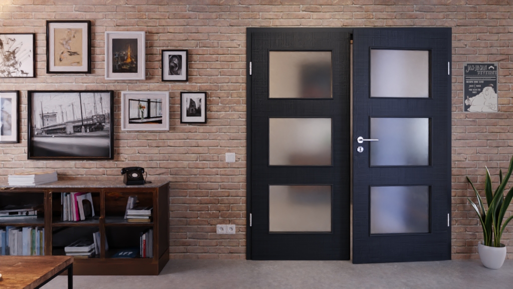 Drzwi wewnętrzne podwójne z przeszkleniem i powierzchnią odporną na UV:
