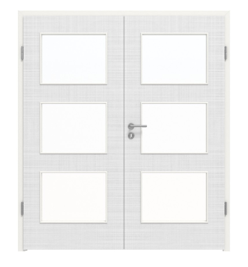 Łatwy w pielęgnacji dekor tekstylny jest ozdobiony delikatnymi liniami w poziomie i pionie, które są wytłoczone w warstwie wierzchniej. Wysoka trwałość zapewniają właściwości odporne na zarysowania i ścieranie. Oprócz białej powierzchni, trzy prostokątne przeszklenia nadają nowoczesny wygląd.