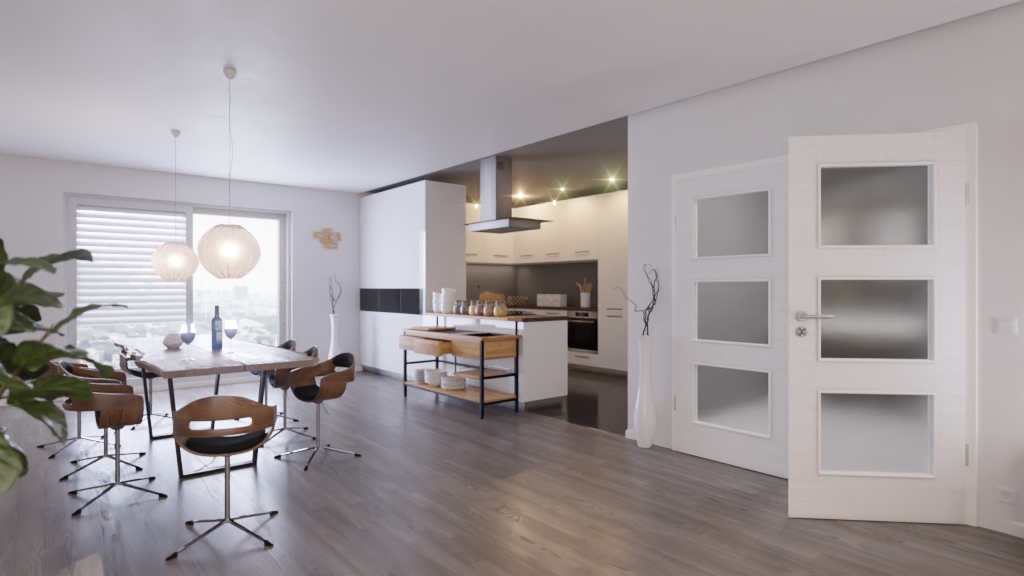 Wewnątrz 40 mm grubości skrzydła drzwi znajdują się płyty wiórowe pełne, co czyni model odpornym na uderzenia. W standardowym wyposażeniu znajduje się również ościeżnica, zamek wielozadaniowy, listwy szklane oraz cztery dwuczęściowe zawiasy.