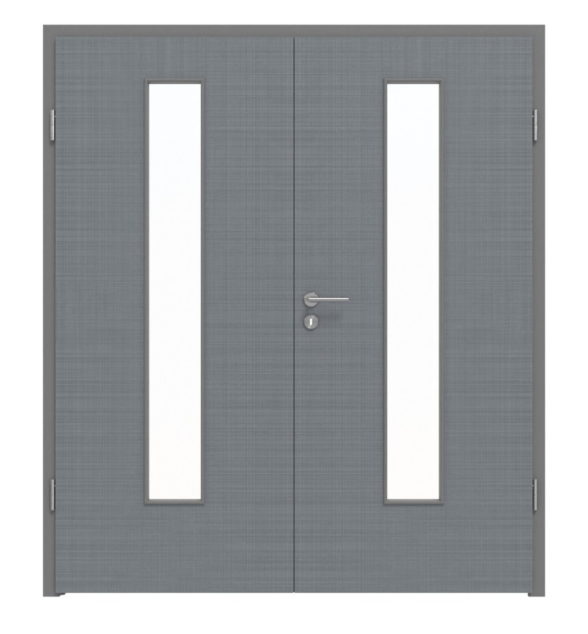 Oba skrzydła drzwi o grubości 40 mm są chronione przed codziennymi uderzeniami dzięki płycie wiórowej w środku. W standardowym zakresie dostawy znajdują się oprócz ościeżnicy, listew szklanych i zamka z wieloma kluczami cztery 2-częściowe zawiasy.