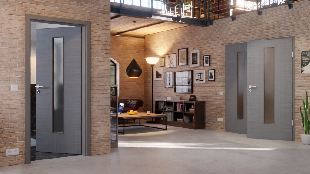 Drzwi o nietypowym wyglądzie: Drzwi podwójne w kolorze Cotton Like Hygge Grey, podobne do RAL 7037 z serii Versio od Lebo sprawiają, że Twoje pomieszczenia stają się jasne.