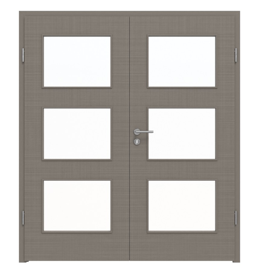 Dzięki delikatnym liniom powstaje naturalny wzór na szaro-brązowym dekorze tekstylnym. Możesz go doświadczyć również dotykowo dzięki wytłoczonej strukturze. Ponieważ warstwa wierzchnia jest odporna na ścieranie i zarysowania, łatwo ją oczyścić z codziennych zabrudzeń. Trzy przeszklenia nadają elegancki charakter skrzydłu drzwiowemu.