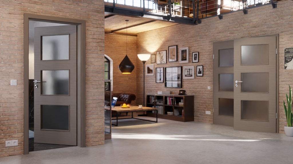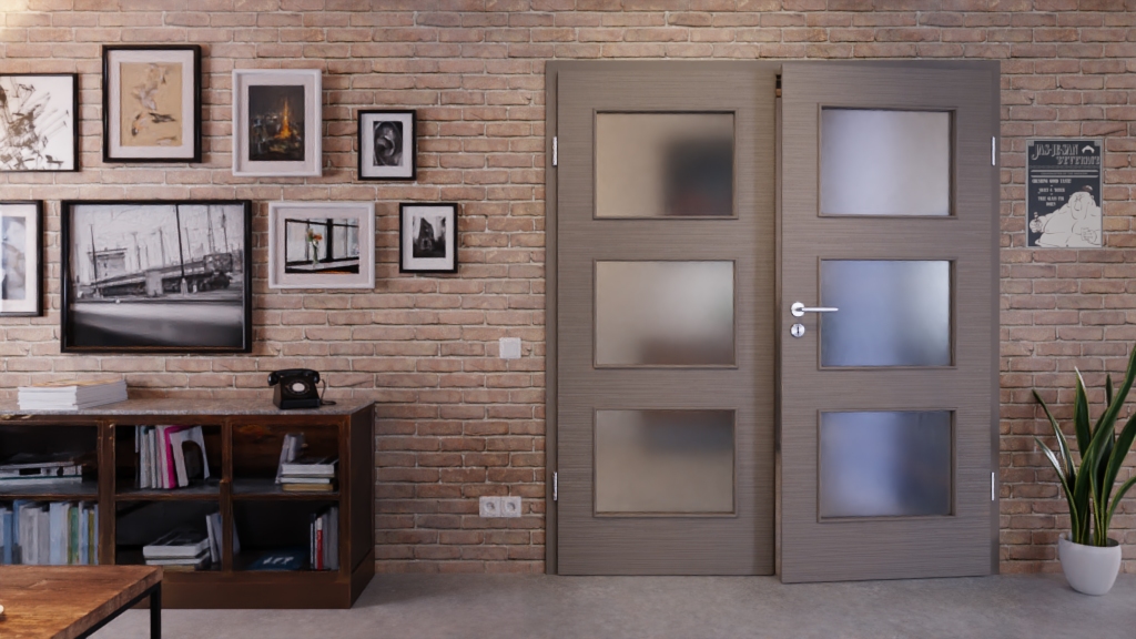 Drzwi wewnętrzne podwójne z wlotem szklanym i dekoracją odporną na UV: