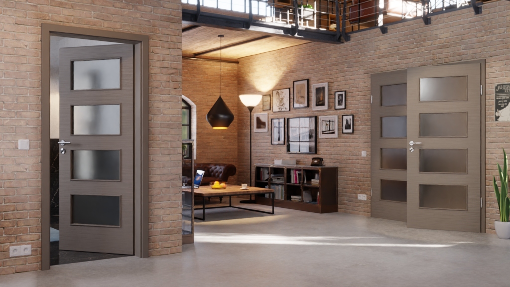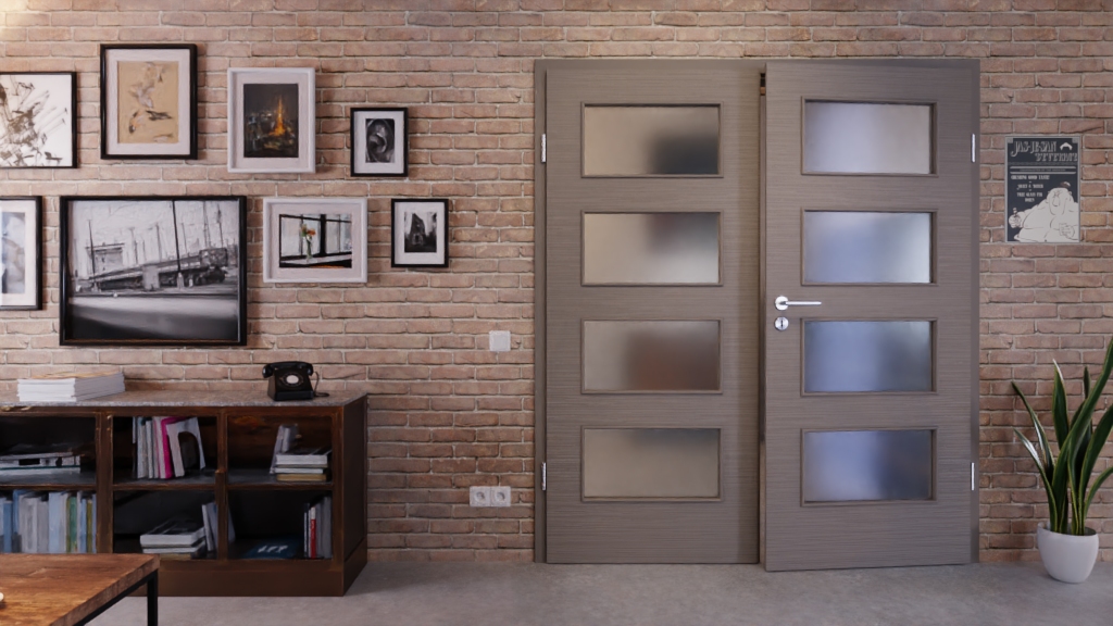 Drzwi wewnętrzne podwójne o przezroczystym charakterze i odpornej na ścieranie powłoce: