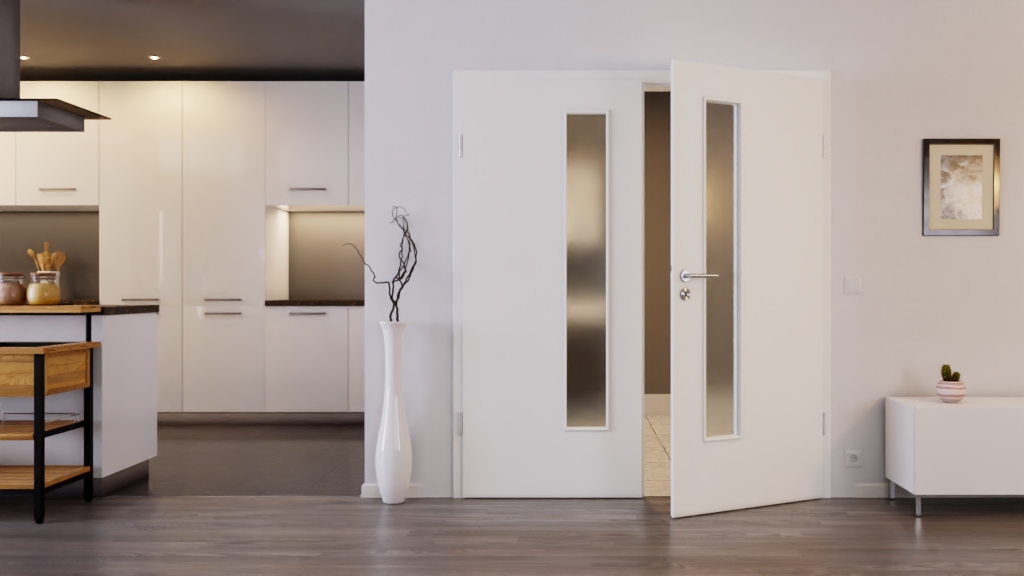 Model drzwi podwójnych z przeszkleniem i odporną na ścieranie powierzchnią: