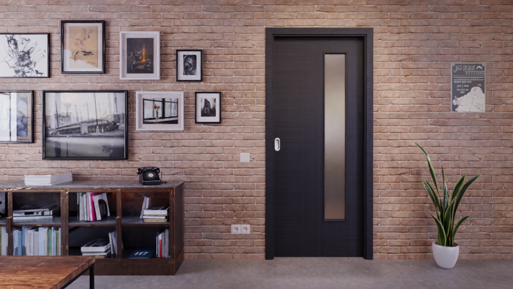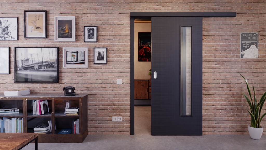 Nowoczesne drzwi przesuwne z odporną na ścieranie dekoracją, w tym prowadnicą podłogową: