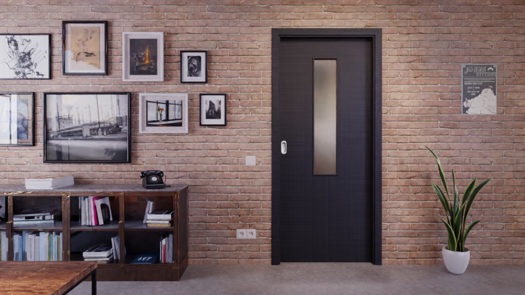 Poziome i pionowe linie nadają dekoracji tekstylnej naturalny wygląd, który dzięki odpornym na ścieranie i zarysowania właściwościom utrzymuje się przez długi czas. W środku skrzydła drzwi znajduje się prostokątny otwór na światło, co nadaje modelowi przejrzystości.