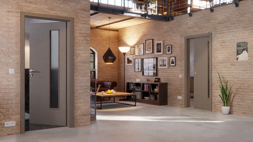 Wzór z delikatnych linii na szaro-brązowym dekorze tekstylnym można również doświadczyć dotykowo dzięki wytłoczonej strukturze. Naturalnie zaprojektowana warstwa wierzchnia jest łatwa w pielęgnacji i trwała. Dzięki wąskiemu przeszkleniu po stronie zawiasów światło przenika do Twojego domu.