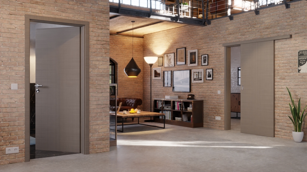 Dla komfortowego mieszkania: Eleganckie wykończenie powierzchni drzwi przesuwnych w kolorze Cotton Like Taupe z serii Versio od Lebo sprawia, że model ten przyciąga wzrok.