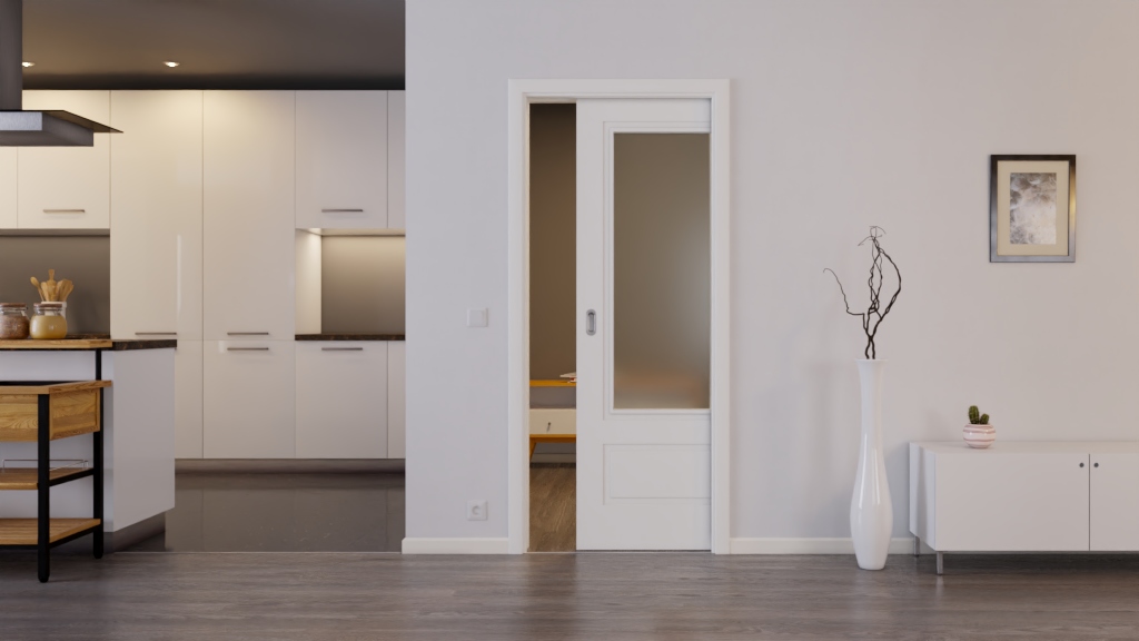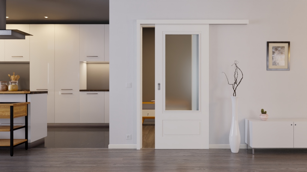 Drzwi przesuwne Lacuna 41-LA1 w skandynawskim designie z przeszkleniem