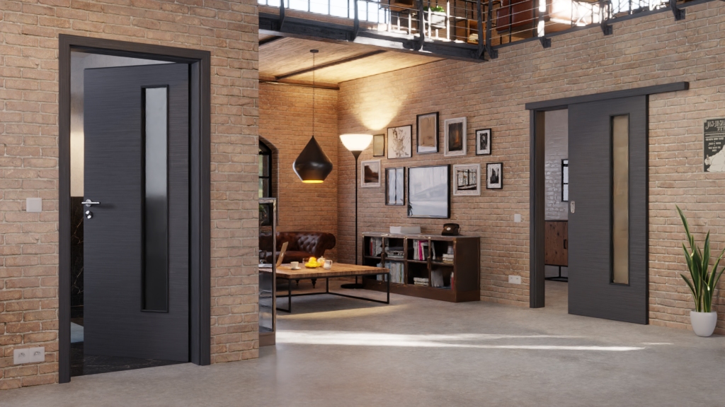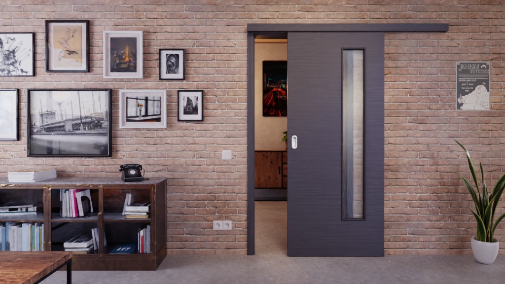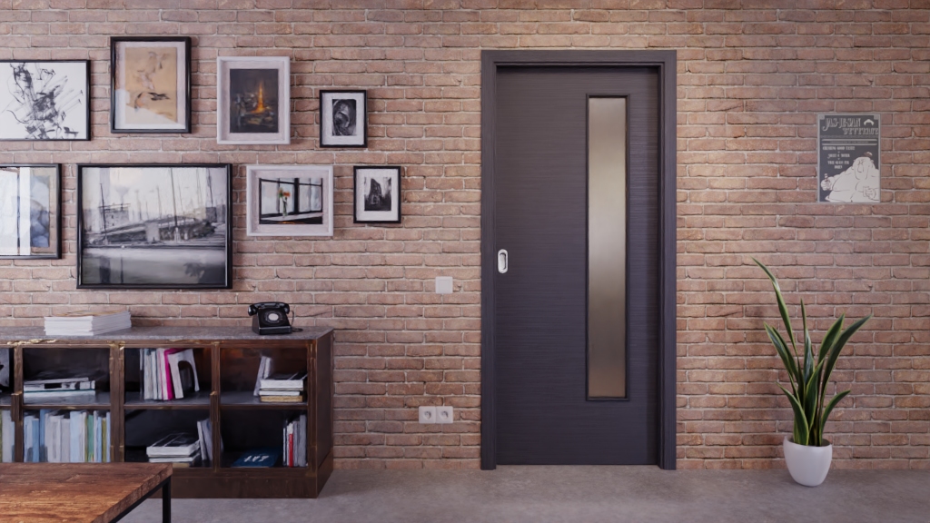 Solidne drzwi z dekoracją odporną na zarysowania, w tym prowadnicą podłogową: