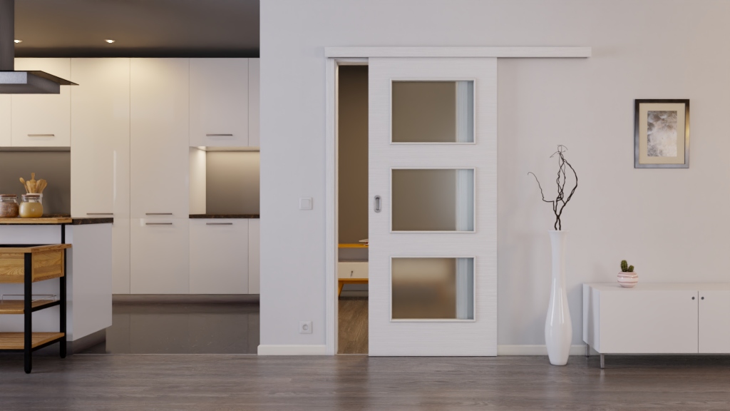 Stylowe drzwi z powłoką odporną na zarysowania i prowadnicą podłogową: