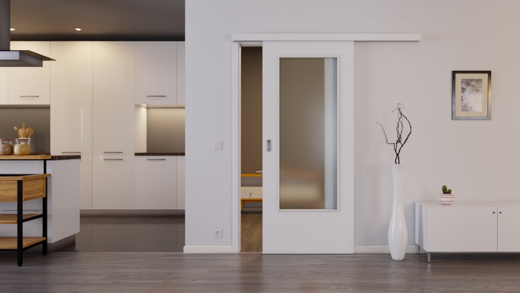 Eleganckie drzwi przesuwne z odpornym na ścieranie wykończeniem, w tym prowadnica podłogowa: